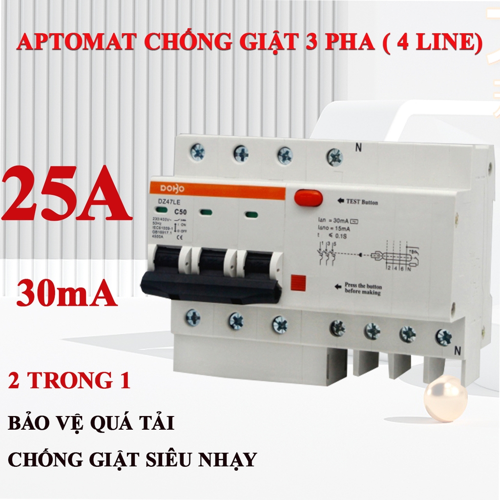 - Cầu dao chống giật RCCB DoBo 3 PHA 25A 4.5kA DZ47LE-88253P: với nhiều tính năng vượt trội đảm bảo an toàn cho người sử dụng cũng như các vật dụng khác trong gia đình để khi có chập điện, cầu chì đứt, mạch điện hở, không xảy ra cháy nổ hay điện giật nguy hiểm đến tính mạng.