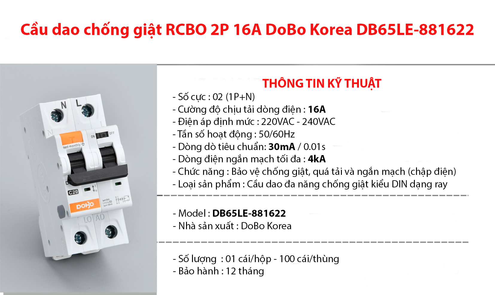 - Lưu ý : RCBO là sự kết hợp giữa MCB + RCCB . Trong đó, MCB được hiểu là cầu dao tự động có 2 chức năng là chống quá tải và chống ngắn mạch. Còn RCCB là dạng cầu dao chỉ có chức năng chống giật. Do vậy để kết hợp 2 sản phẩm này tạo thành 1 mà DoBo cho ra đời dòng đa năng RCBO với cả 3 chức năng chính là :